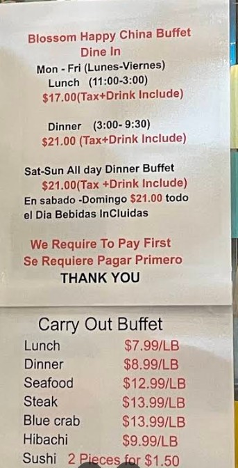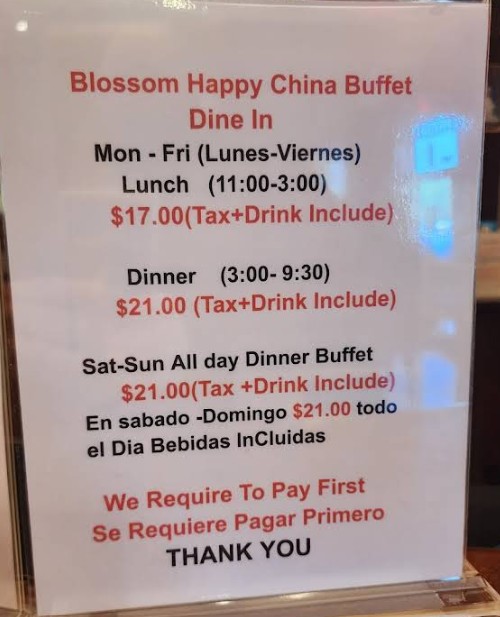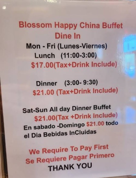 Blossom Buffet is open on Monday, Tuesday, Wednesday, Thursday and Sunday from 11:00 AM - 9:30 PM; Friday and Saturday from 11:00 AM - 10:30 PM.